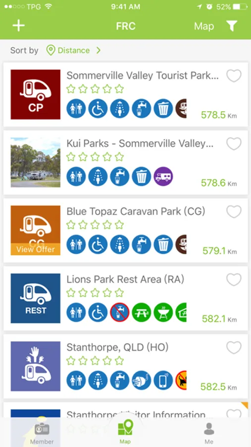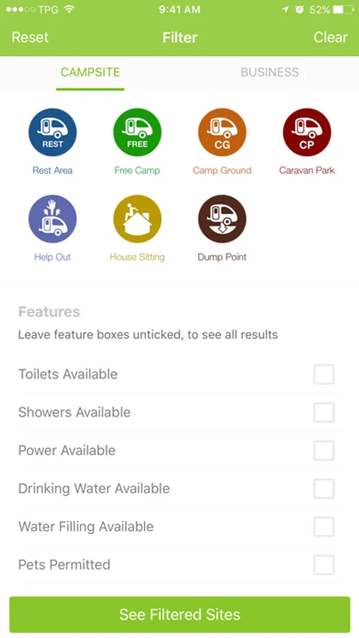 Filter your search criteria to include the features you must have at a site, including Toilets, Showers, Power, Pet Friendly etc. The site is then presented in either Map or List view in order of distance from your location.