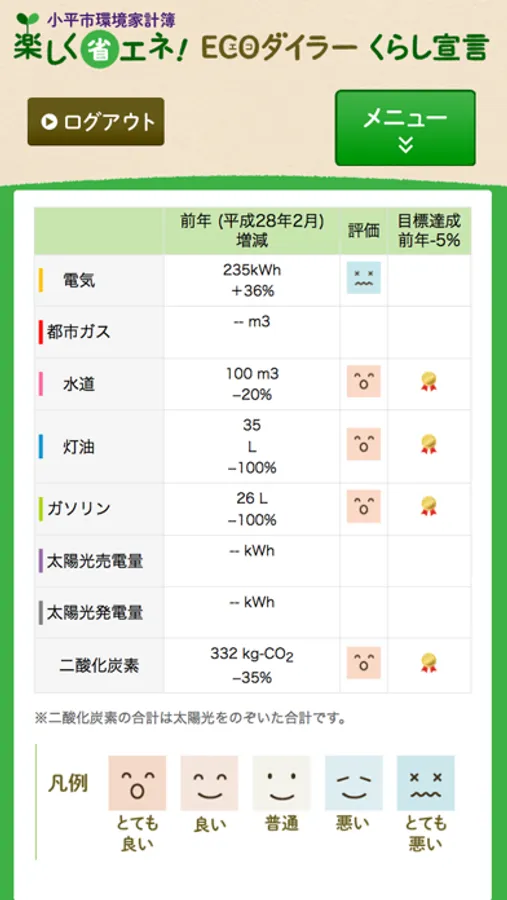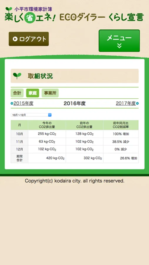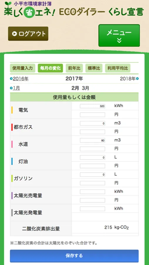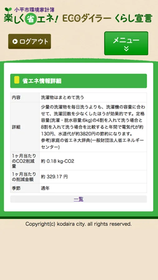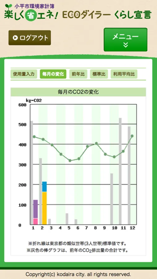 小平市環境家計簿「楽しく省エネ!ECOダイラーくらし宣言」は、家庭や事業所で使用する、電気・ガス等の使用量を入力することで、簡単にCO2排出量が算出できるアプリです。