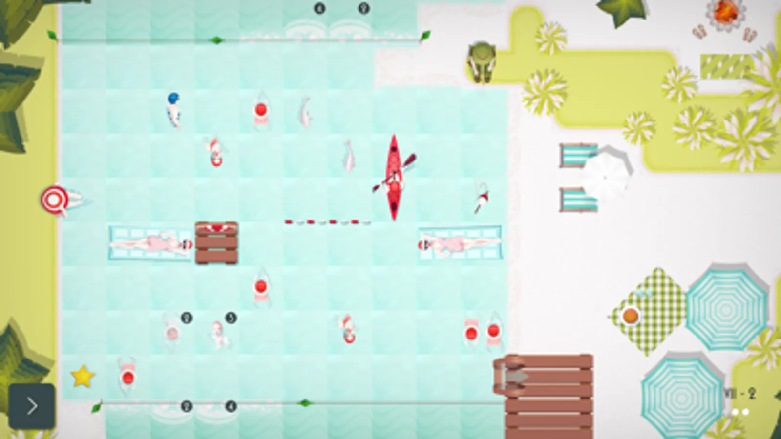 Dive into the relaxing and refreshing atmosphere of Swim Out, a strategic, turn-based puzzle game, that will transport you into a sunny day by the swimming pool, the river or the sea. Plan each of your strokes wisely and be sure to never cross any other swimmer's path if you want to peacefully enjoy the sea view on a cosy chaise-longue.
