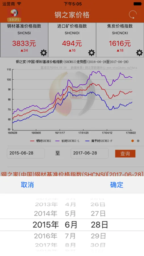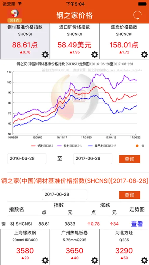 钢之家价格APP是由上海钢之家电子商务股份有限公司开发,可查看钢之家网站发布的各类钢之家价格指数(英文简称SHPI),包括钢之家中国钢材基准价格指数(SHCNSI)、铁矿石价格指数(SHCNOI)、焦炭价格指数(SHCNCKI)、煤炭价格指数(SHCNCI)、钢坯价格指数(SHCNSPI)、铁合金价格指数(SHCNFI)、废钢价格指数(SHCNFSI)、有色金属价格指数(SHCNNMI)、水泥价格指数(SHCNCEMENT)、全球钢材价格指数(SHGSI)及其分类指数和走势图,查看钢之家网站螺纹钢、热轧板卷、方坯、进口矿、焦炭、炼焦煤各主要市场价格及走势图。