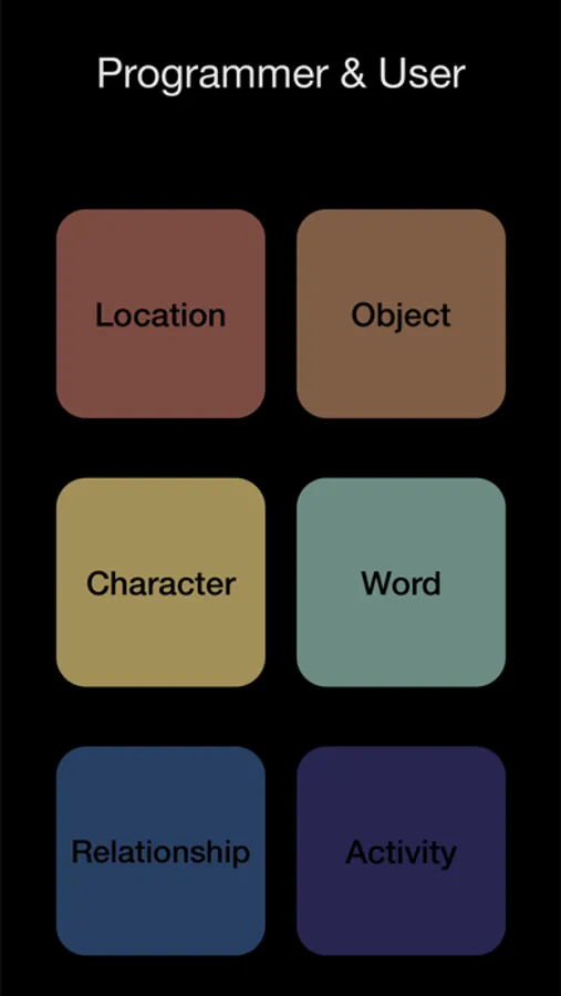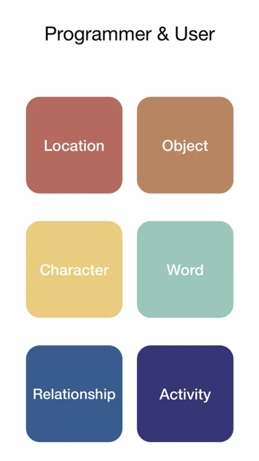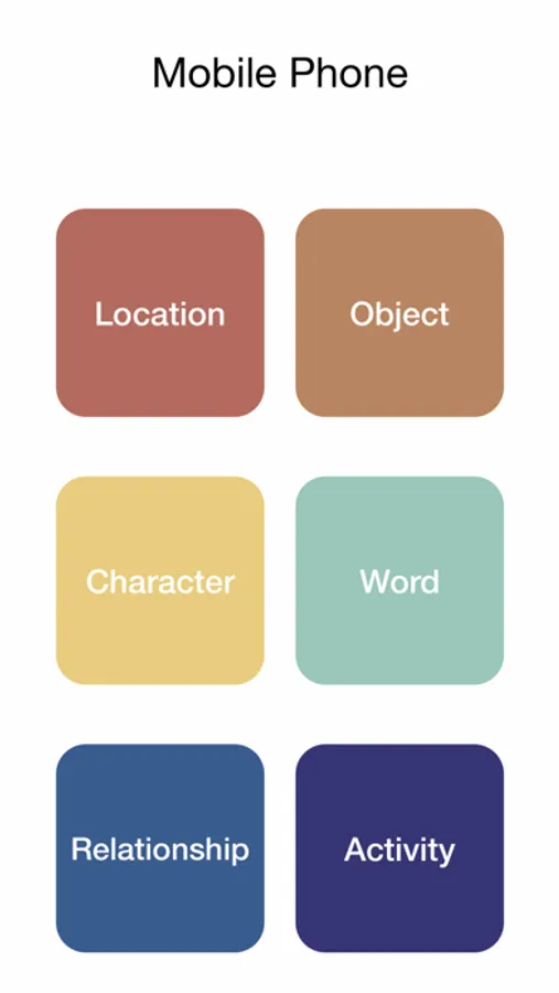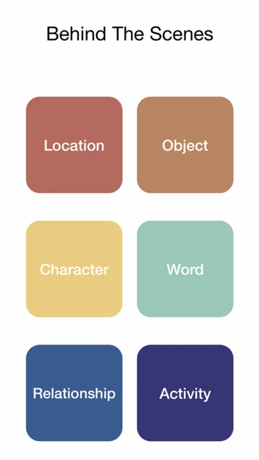 - 6 categories: Locations, Objects, Relationships, Activities, Words, and Character Traits.