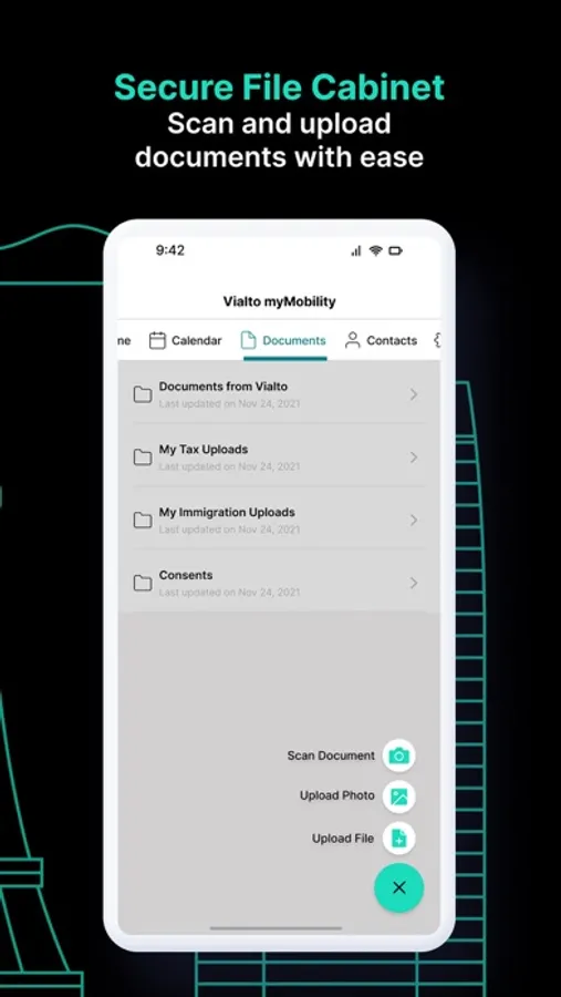 Share your documents via our Secure File Cabinet. Directly upload photos or documents already on your mobile device or scan and share with your Vialto Partners team.