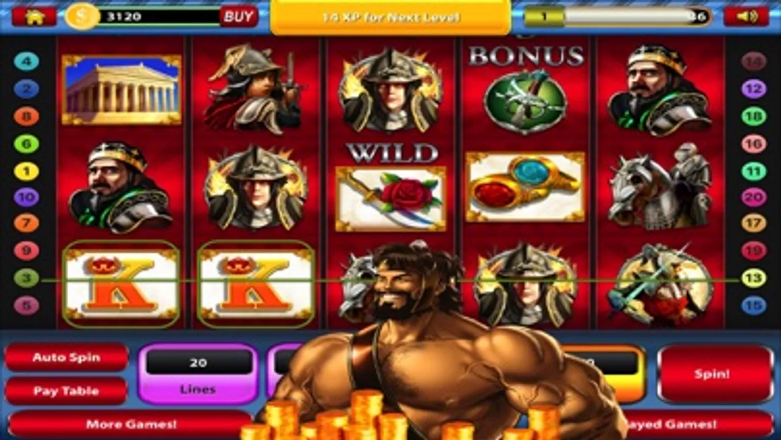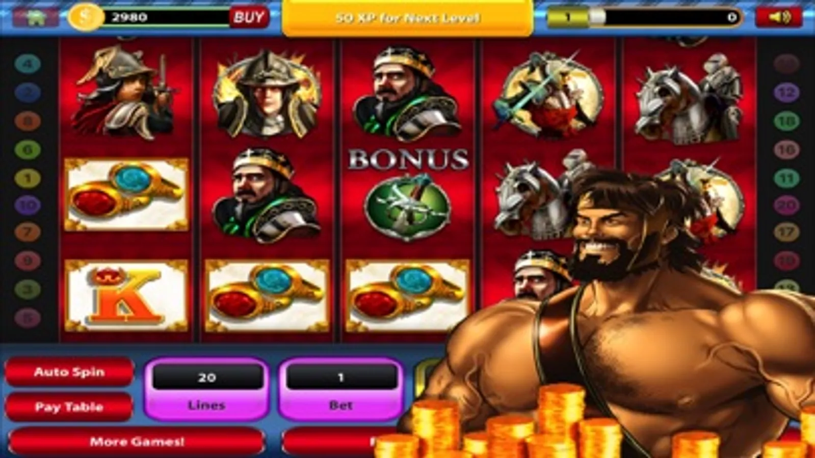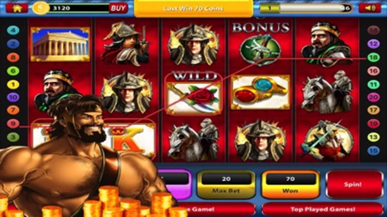 Battle with your favorite Greek God, Hercules! This 5 Reel Slot Machine has tons of bonus features and Huge Payouts for continued free play.