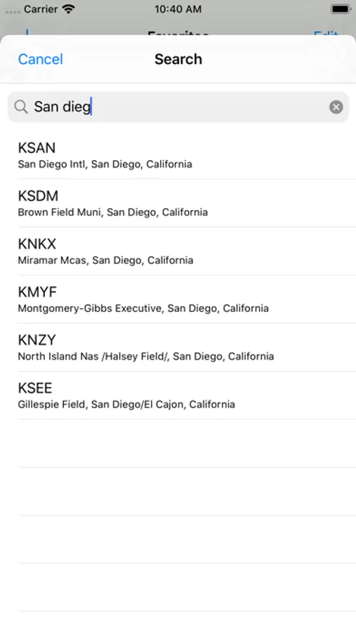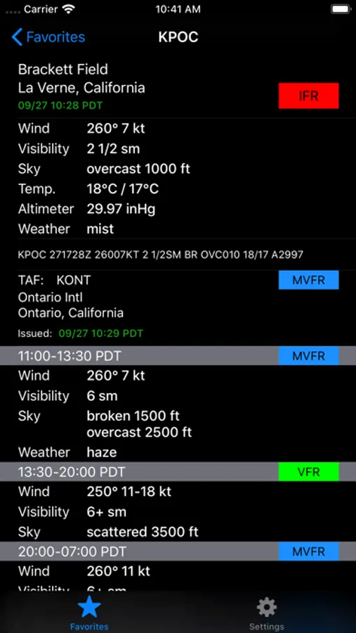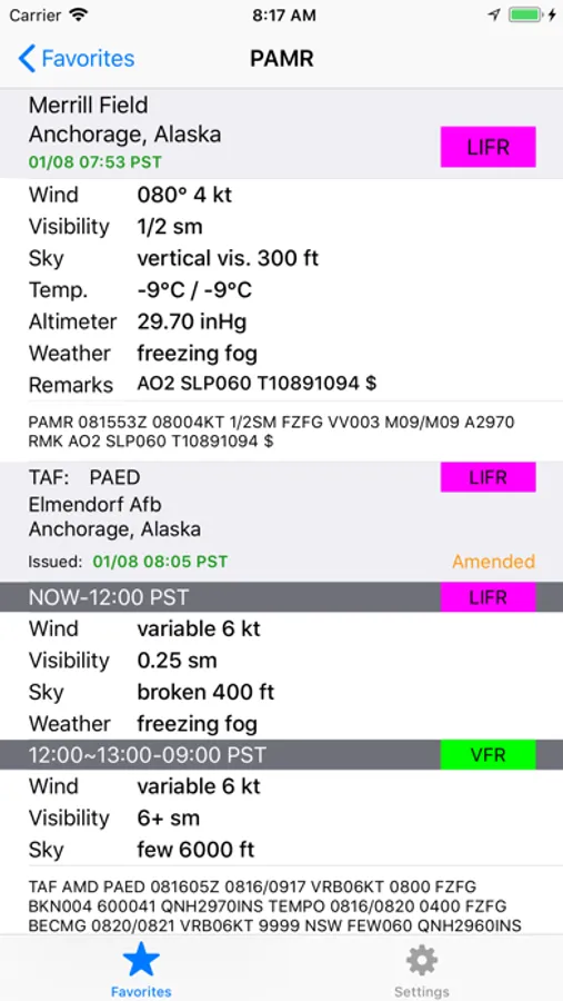 Use voice or scribble feature to search airports by name, city or identifier, view current weather (METAR) and forecast (TAF). Look up nearby airports using location services (permission needed). Use the app on iPhone to manage favorites and settings. The phone app also provides weather summary view for your favorite airports and allows to dive into METAR&TAF for each airport from the list.