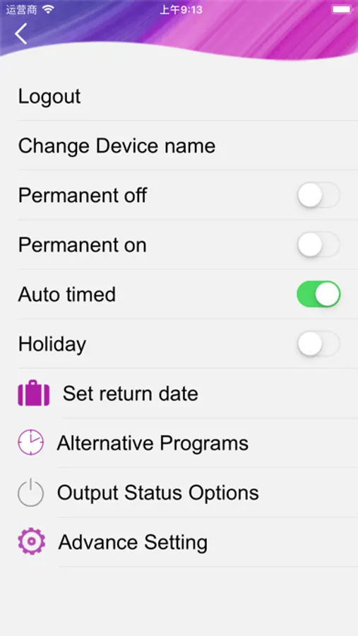 There are 4 operating modes, Auto, Permanent off, permanent on, and holiday. There are also advance and boost functions.
