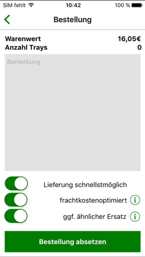 - Die Anzahl der bestellten Trays und der Warenwert wird dabei ständig angezeigt, so dass Sie stets einen Überblick über Ihre Bestellung haben.