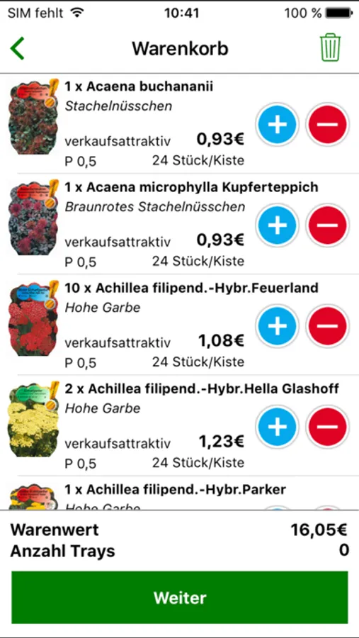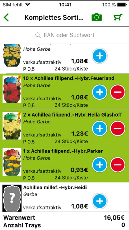 - Zu jeder Sorte wird ein Bild, der botanische und deutsche Name, der Blühstatus, Topfgröße, Preis und Verpackungseinheit angezeigt.