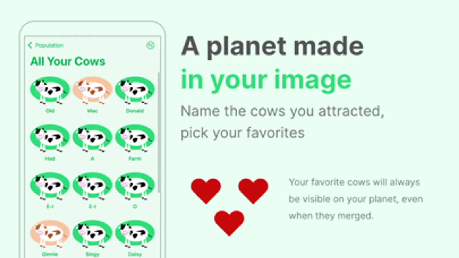• Gaze on your planet as it starts to attract cows, which happens each time you have one day worth of meals. Beware of scaring them!