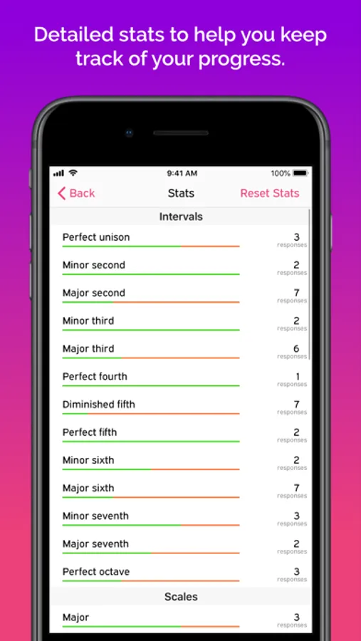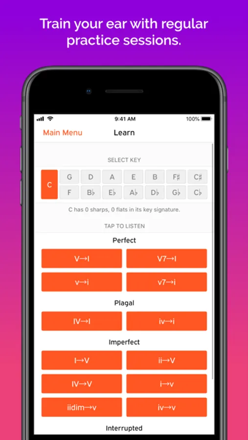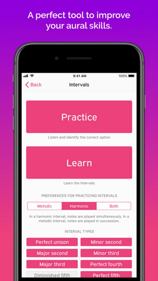 You can use Aural Wiz in two modes - Learn and Practice. In Learn mode, you can play back an interval, scale, chord or a cadence to understand how it sounds. In Practice mode, a melodic or harmonic pattern will be played and you'll be asked to identify the interval, scale, chord or cadence. Practicing this way has been a proven way to improve your aural skills. Make Aural Wiz part of your daily aural improvisation routine.
