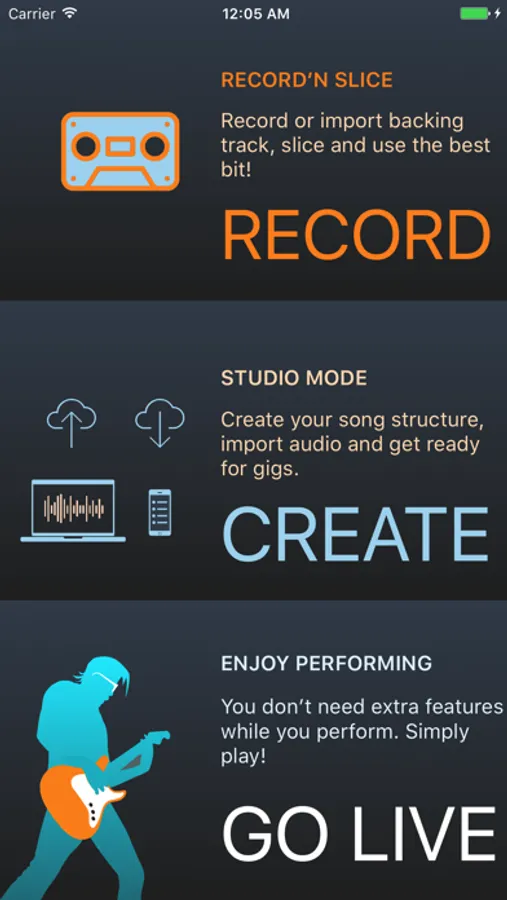 - Import / record audio files (backing tracks) from computer or Cloud services