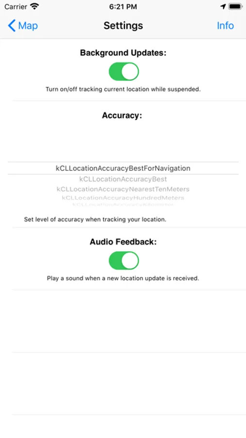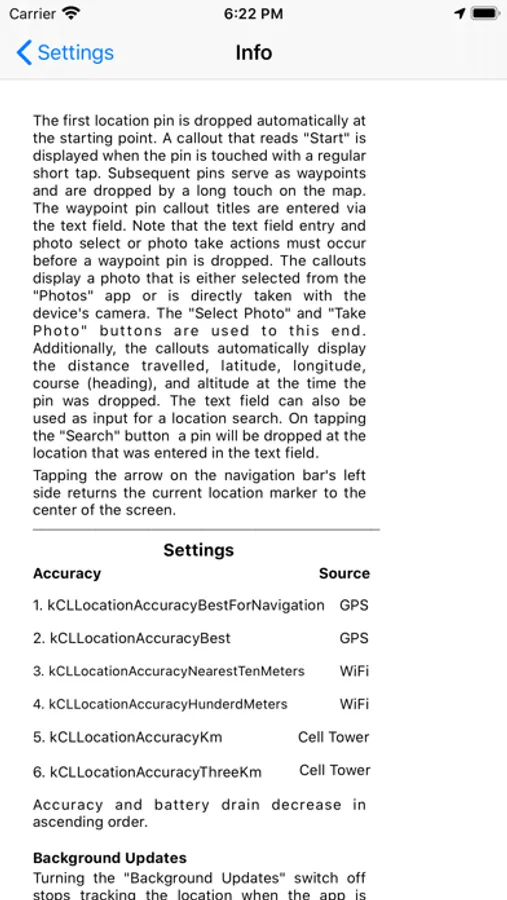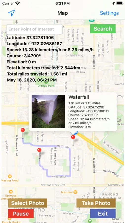 -Waypoint pins are dropped on the map by a long touch and callouts are displayed by a regular touch on the pins. This latter action displays the point of interest entered previously in a text field, a thumbnail of a photo that was taken with the device's camera or selected from the "Photos" app and the distance traveled at the time the pin was dropped.