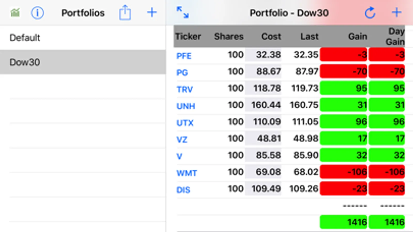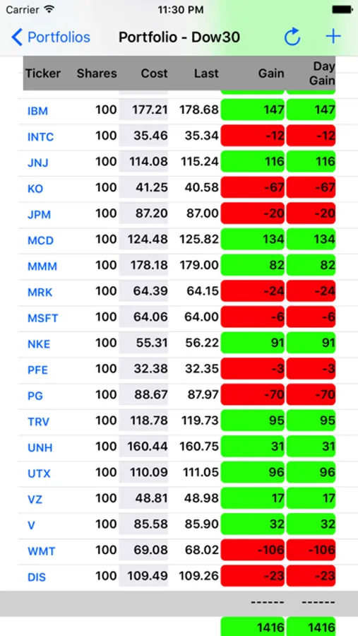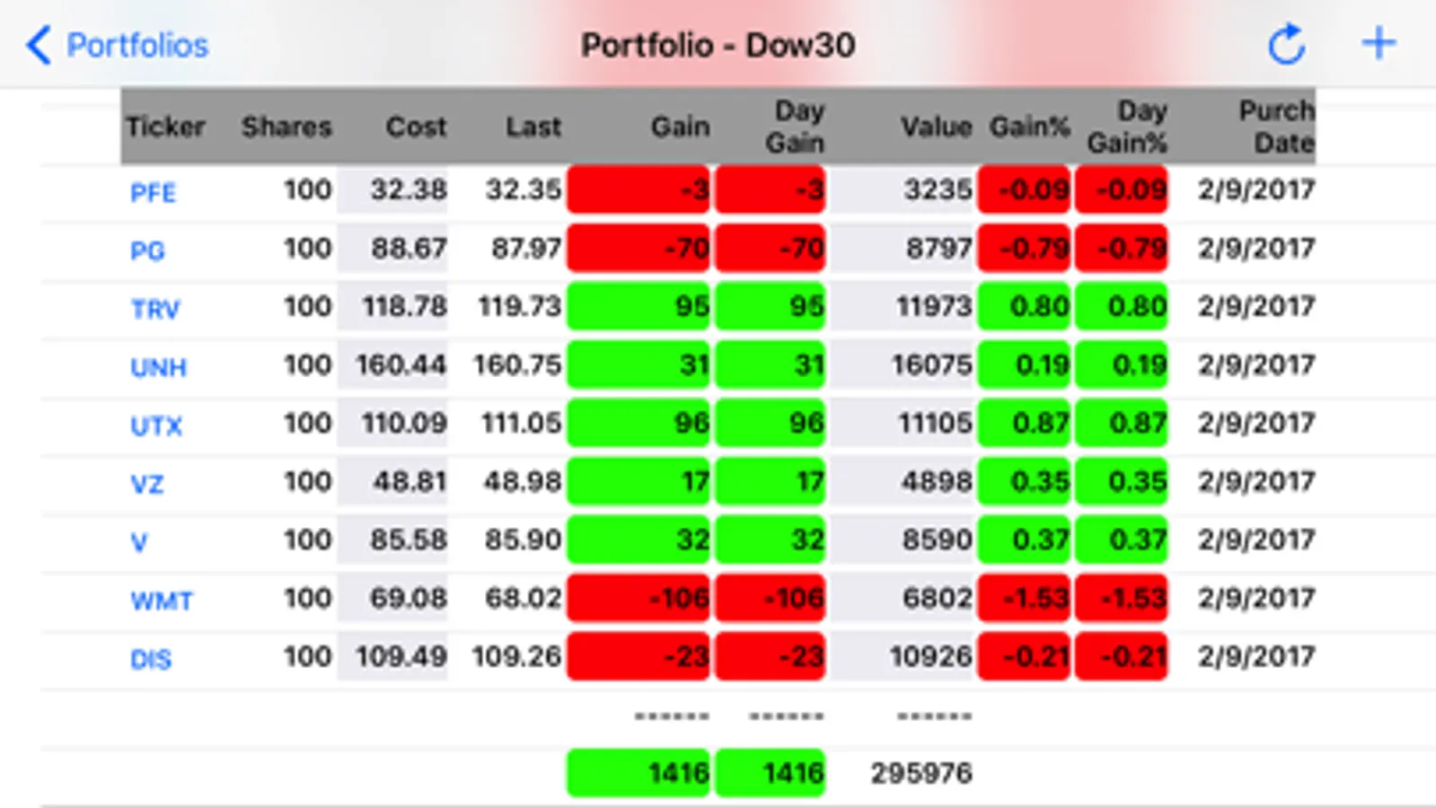 Portfolios may be added to (+) and removed from (swipe left) the list of managed portfolios. Stock tickers may added to (+) and removed from (swipe left) a selected portfolio. Totals are calculated and displayed for gains, day gains, and total values. Quote values may be refreshed by tapping the refresh symbol in the top navigation bar. Tapping the ticker symbol will launch a browser to display additional stock related data that is available for that ticker from Yahoo Finance.