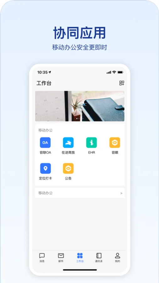 [智能办公]提供企业邮箱、企业新闻等与企业办公相关业务系统,使企业办公智能化,同时在这些工作流中场景化的嵌入通信能力,实现业务的移动化与通信的融合化。