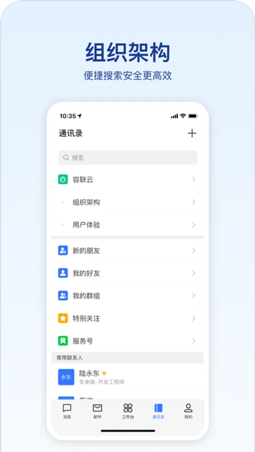 [统一通讯录]支持导入企业内外部联系人和组织架构进行统一管理;支持高管保护模式、员工分级管理功能;通讯录水印加密,防止通过截屏、录屏等方式泄漏企业架构信息。