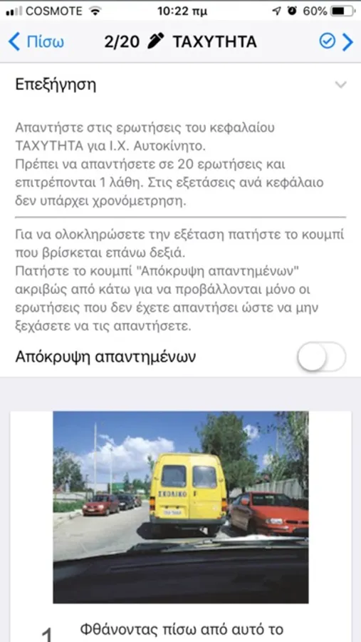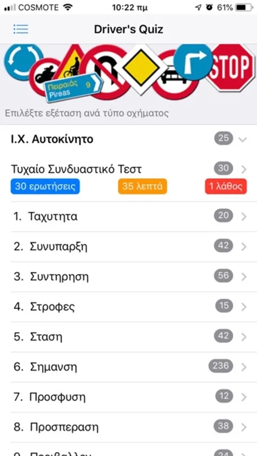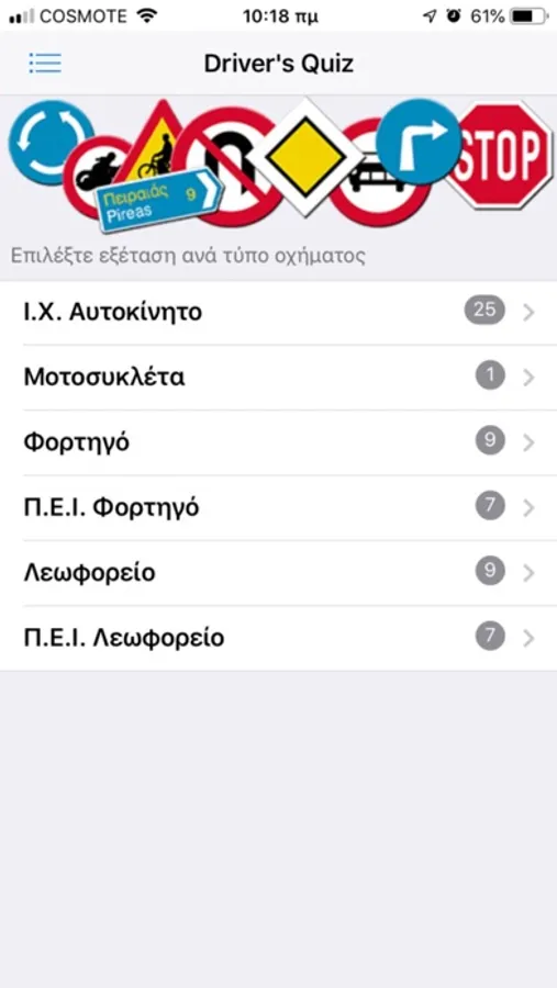 Η εφαρμογή περιέχει όλες τις ερωτήσεις του Υπουργείου Μεταφορών ανά κεφάλαιο και ανά τύπο οχήματος. Τύποι οχημάτων: