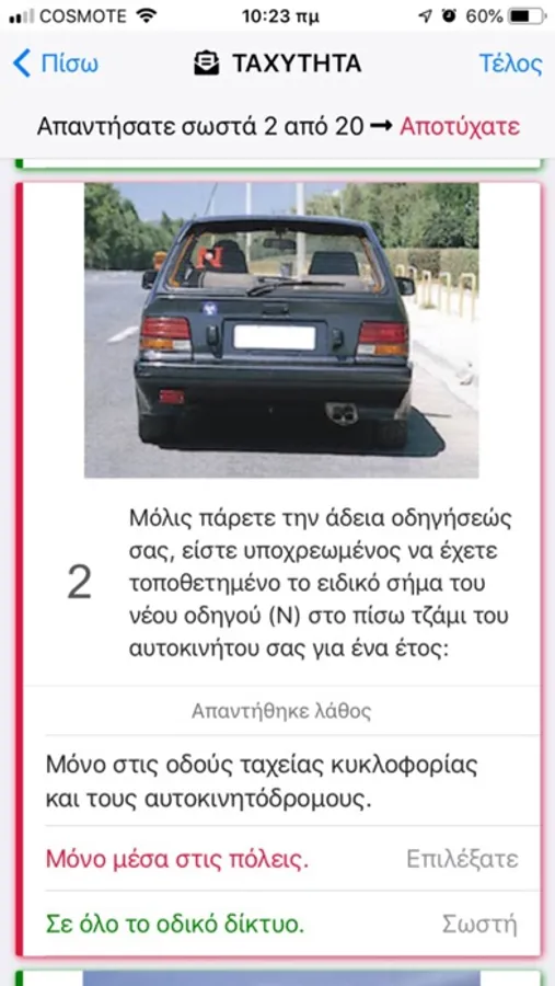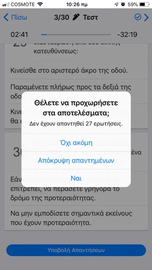 Επίσης παράγει εξετάσεις με τυχαίες ερωτήσεις από όλα τα κεφάλαια για τον τύπο οχήματος που διαλέγετε. Σας δείχνει πόσα λεπτά έχουν περάσει και πόσος χρόνος σας απομένει ακόμη για την ολοκλήρωση της εξέτασης. Το πλήθος των ερωτήσεων σε κάθε τυχαίο τεστ καθώς επίσης και το πόσα λάθη επιτρέπονται και η διάρκεια εξέτασης διαφέρουν ανά τύπο οχήματος και είναι όλα σύμφωνα με το Υ.ΜΕ.