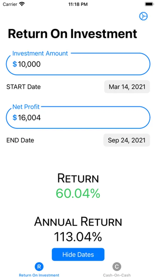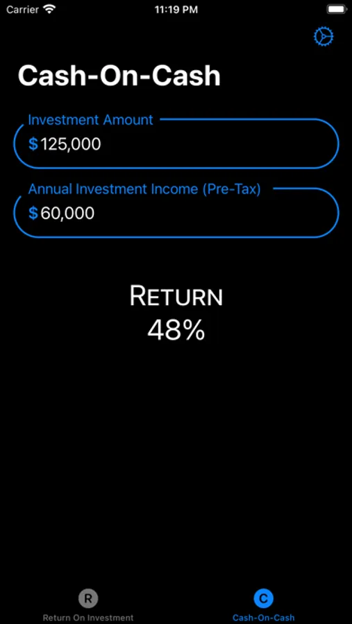 Instantaneously see your ROI and Cash-On-Cash calculation results as you type in your numbers in the Cash On Calc app. Never worry again about remembering the formulas to calculate your investments, because the Cash On Calc app does it all for you! Return On Investment formula? We've got you covered. Cash-On-Cash formula? Yep, that, too! As a bonus, an internet connection is NOT NEEDED to use this calculators in this app. This gives you the freedom to crunch your numbers on the go: just start typing, and your results appear!