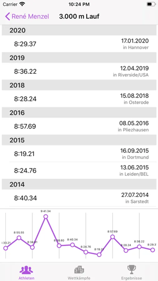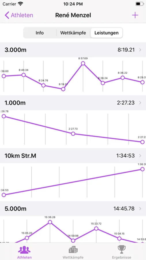 Siehe alle Wettkämpfe für die ein Athlet gemeldet ist und zeige dessen Leistungsentwicklung an.