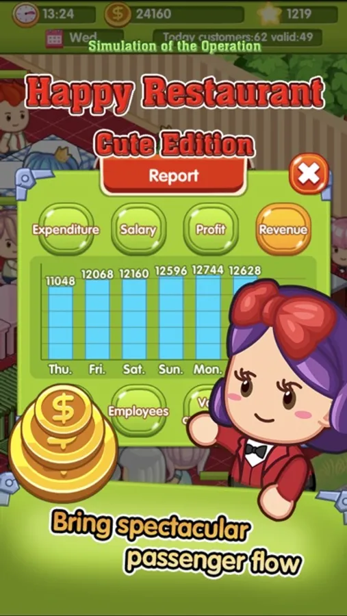 Your employees each have different abilities,speed is for waiter,cook is for chef,charm is for guide,and math is for cashier. 4 occupations carry out their duties,cooperate with each other,serve customers.You just need to hire the right people to do the right job.