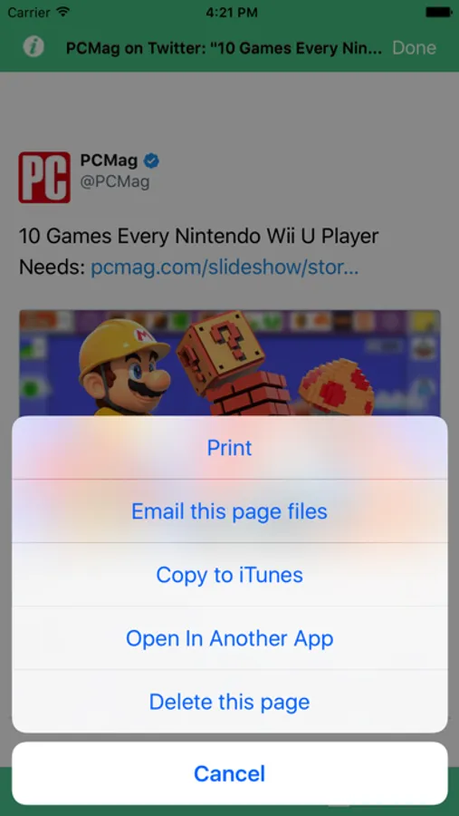 You can also Email saved files (as ZIP or PDF), Print them, or share via other apps. (*)