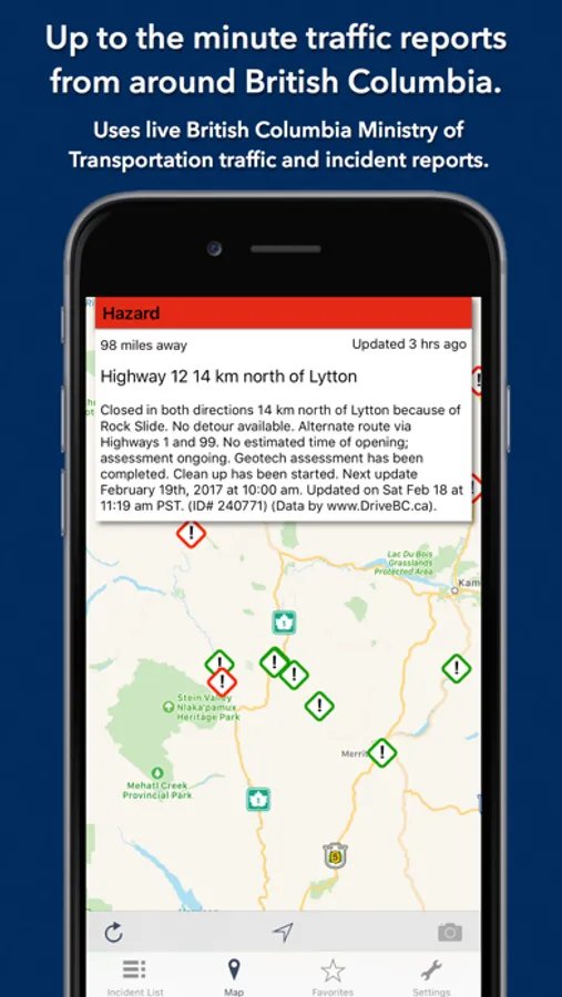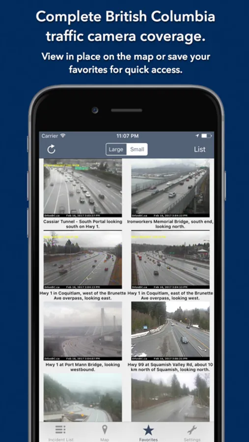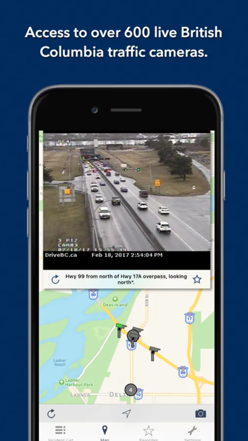 Live traffic reports and cameras for British Columbia including Vancouver. Save your favorite cameras for quick access. The app was updated during January 2023.