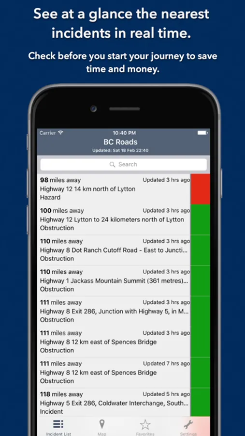 - Shows current incidents in order of distance from your current location (closest incidents are shown first).