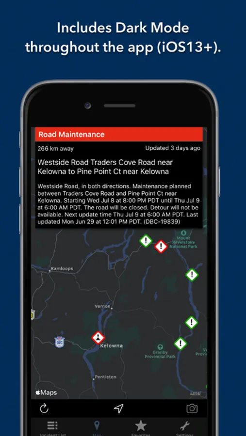 - You can quickly see the distance the incident is from you, the road name and the type of incident.