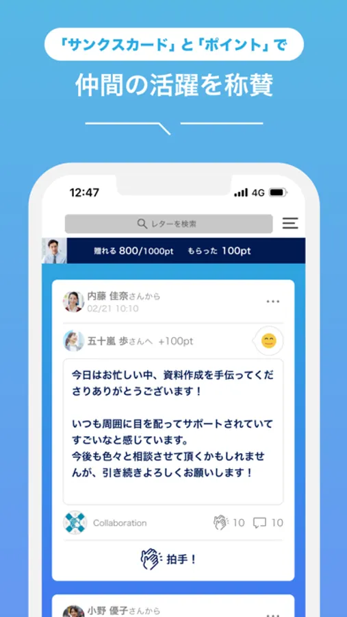 仲間の頑張りや成果に対して、称賛の証 =「レター」を贈ることで、いつもはみえにくい「活躍ぶり」がわかります。