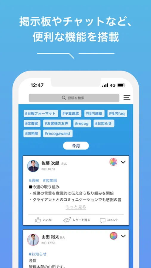 RECOGは、メンバー同士の「称賛」をつうじて、普段はわかりにくい各自の「活躍」がみえるアプリです。
