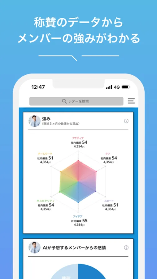 各メンバーが贈った「レター」などの集計から、チーム全体の“活性度合”が天気のようなデザインでひと目でわかります。