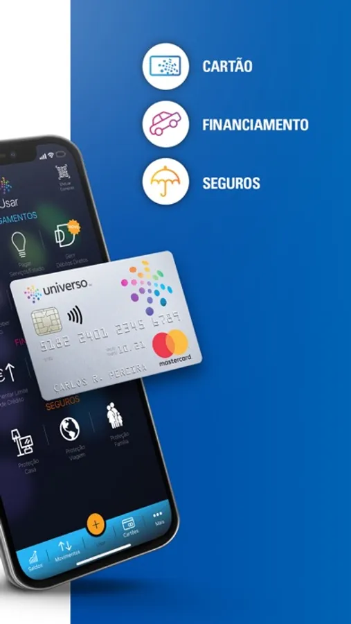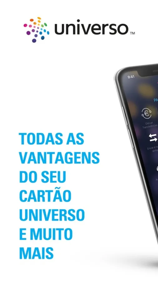 App Universo: O SEU Mobile Banking Infinitamente Simples! É uma aplicação gratuita que lhe dá o controlo do seu Cartão Universo permitindo-lhe fazer pagamentos de forma simples, subscrição de crédito pessoal e automóvel 100% online e acesso a um conjunto de seguros a qualquer momento e em qualquer lugar.