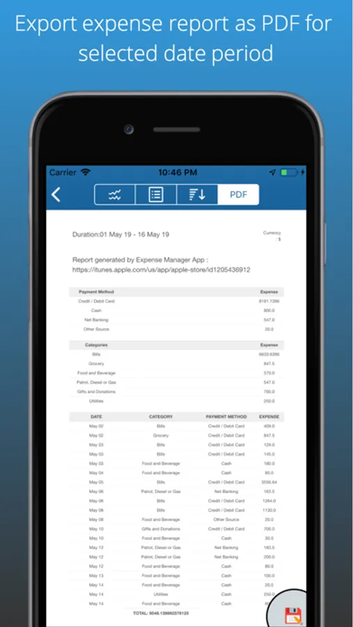 - Export Expense Report in PDF (Go To Statistics > Choose Date Duration > Click 'PDF' button from top right Screen)