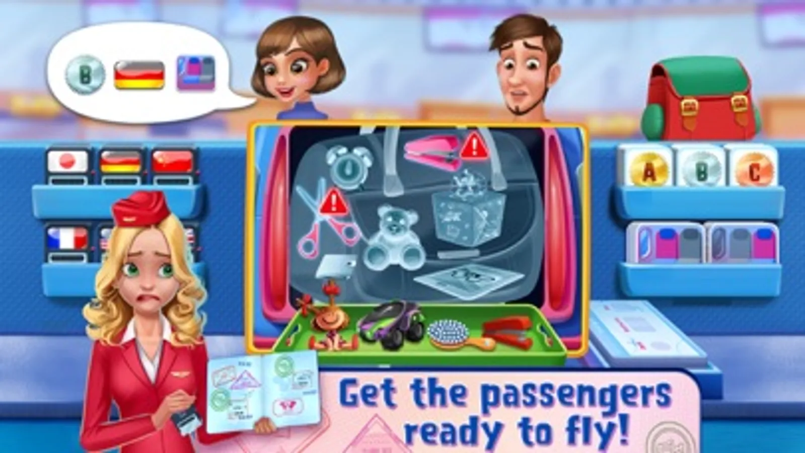 > Help the travelers check in, and attend to the passengers on the plane!
