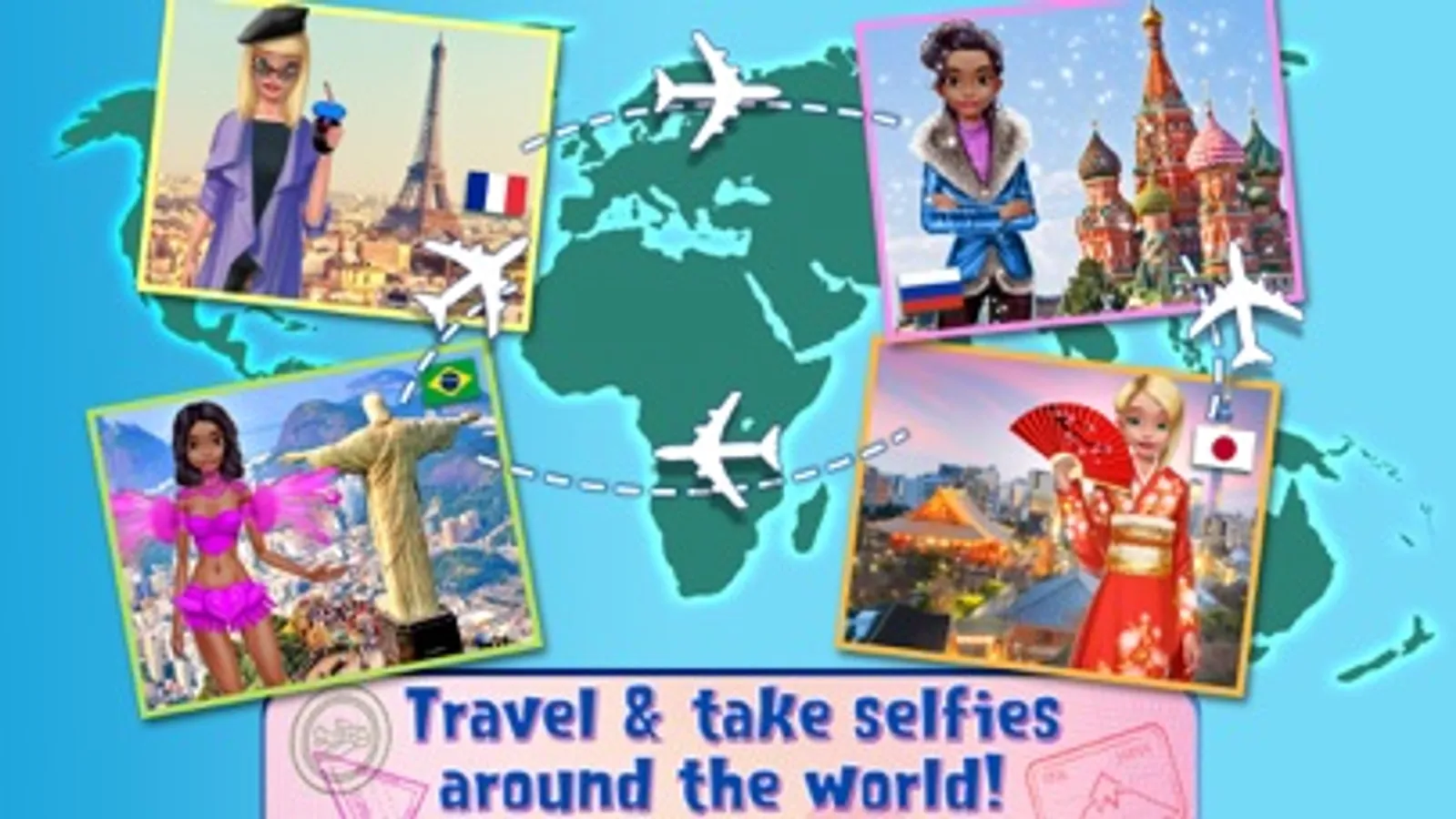 > Visit exotic destinations like Paris, Rio, Moscow and Tokyo! Dress up and take selfies at each place!