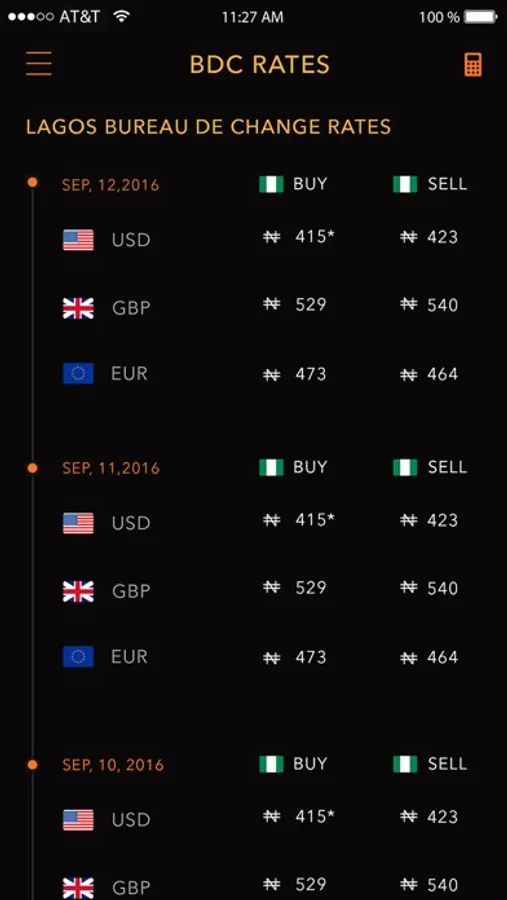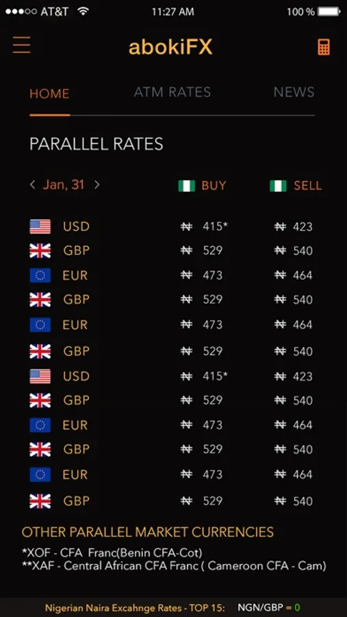 abokiFX provides you with daily naira FX rates against USD (dollars), (GBP) pound sterling, (EUR) Euro and other currencies such (GHS) Ghana Cedis, XAF and XOF Benin and Cameroon Francs. abokiFX also provides daily bank ATM rates, Market FX news, Aboki street news, CBN Rates, Lagos BDC rates, Moneygram and Wester Union rates. It comes with an inbuilt calculator to help ease your currency conversion.