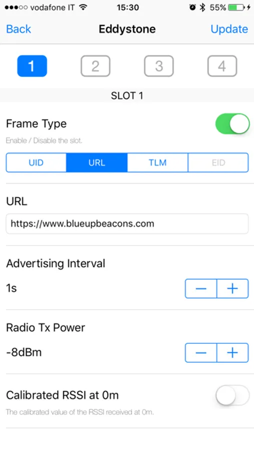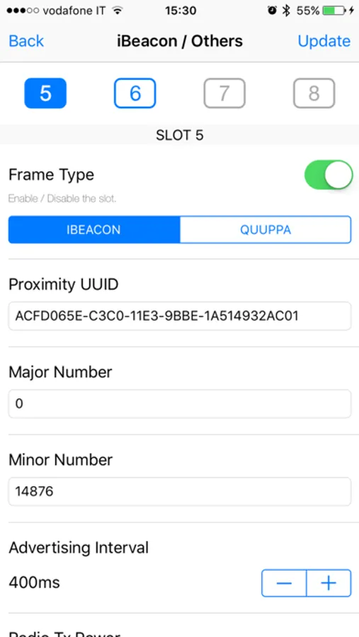 BlueBeacon Manager App allows to configure up to 8 slots for the different packet frames, with the following features: