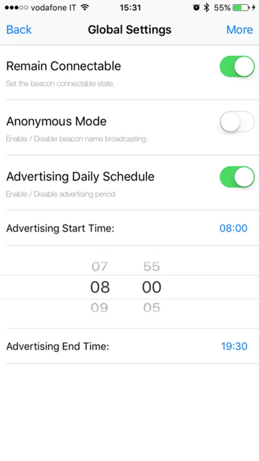 - setting operating mode depending on beacon position (only for BlueBeacon Tag);