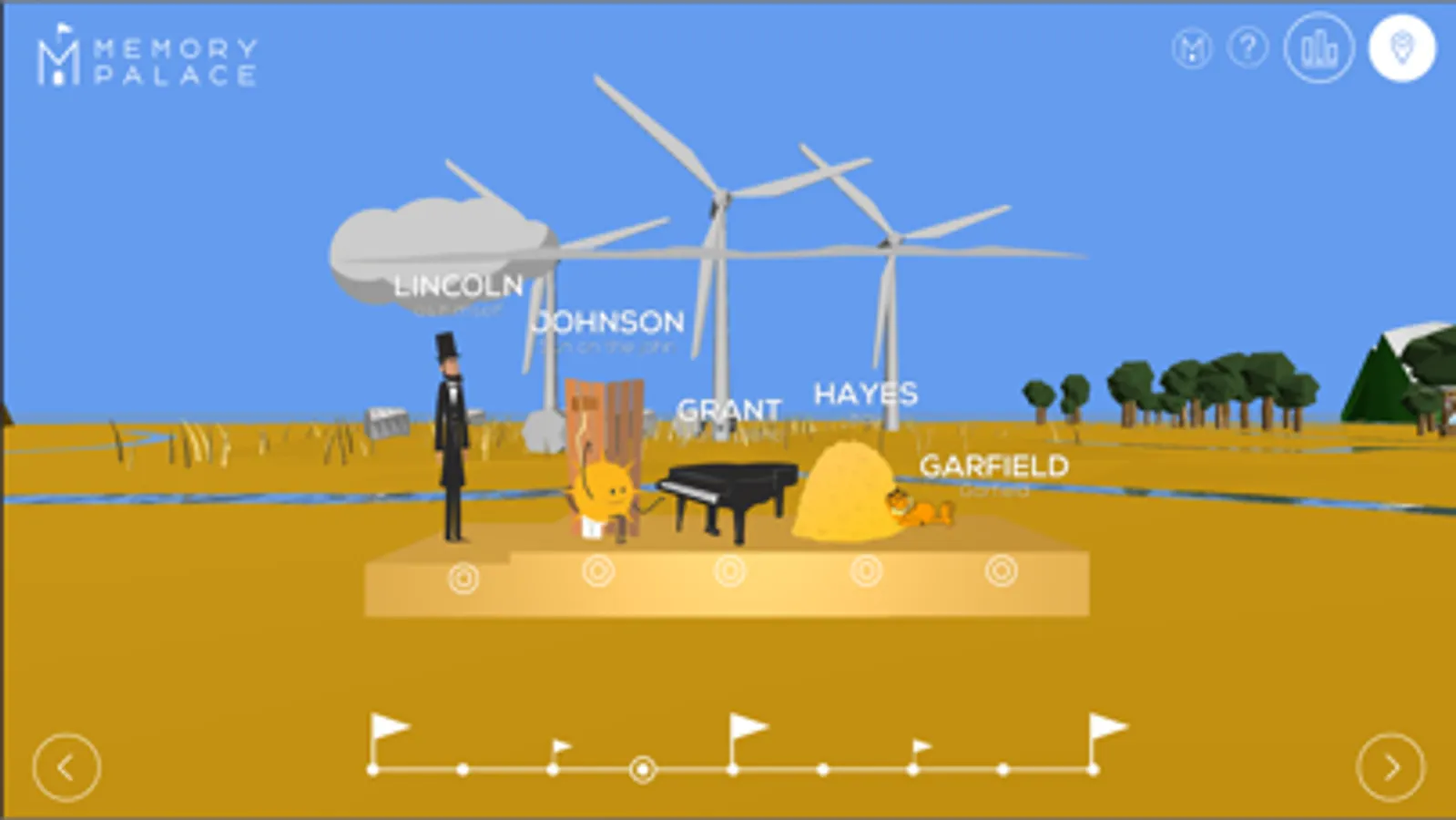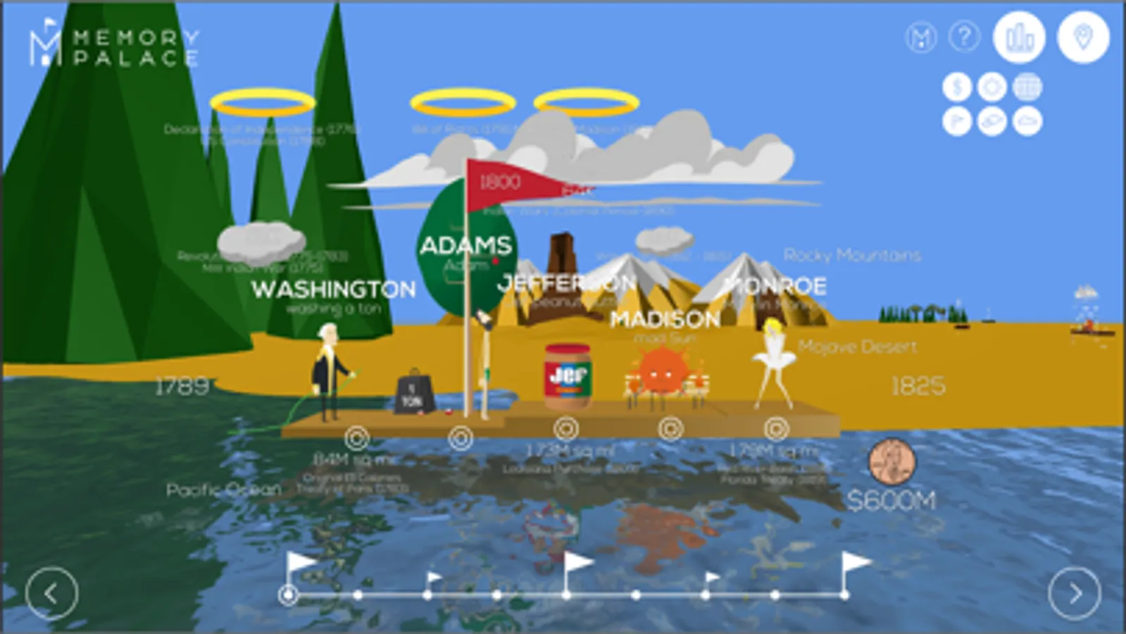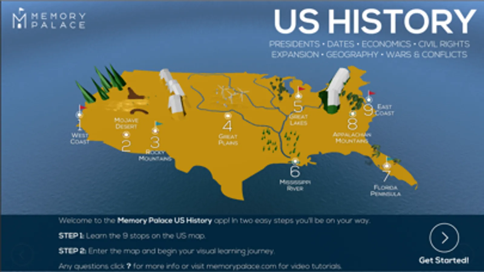 Challenge your mind and memory while learning US History in a fun, new, and creative way. In 30 minutes or less, the Memory Palace US History App lets anyone learn the US Presidents and related US History such as wars, dates, territorial expansion, economics, civil rights milestones, and geography. If you're passionate about the US and its history, this is the app for you.