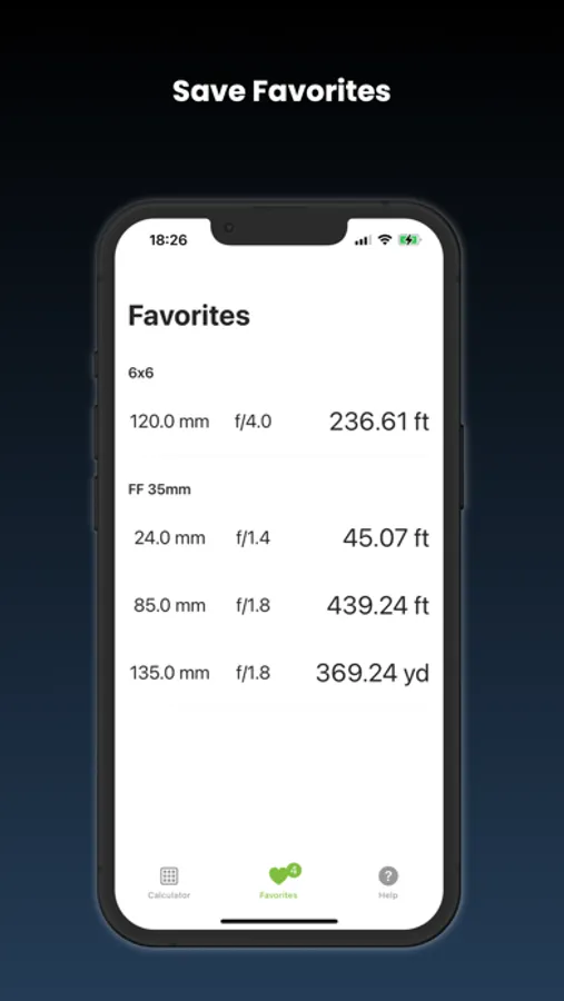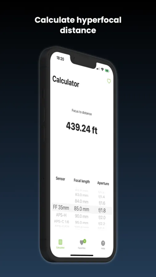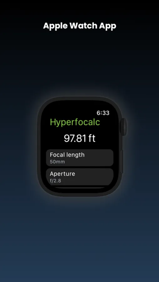 Aplikace nabízí rychlý a přesný výpočet hyperfokální vzdálenosti pro zvolené ohnisko a clonu. Výpočet můžete provádět na Apple Watch či iPhonu.