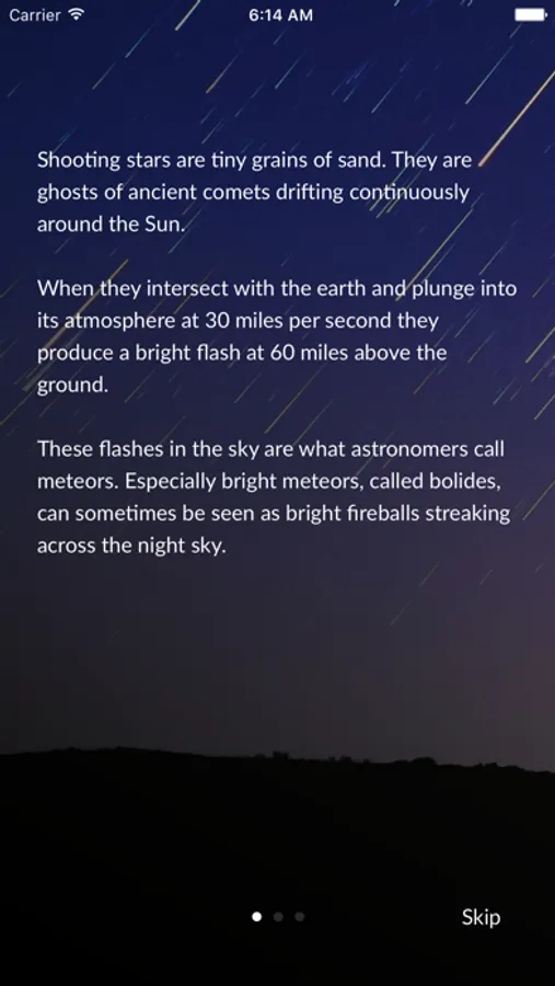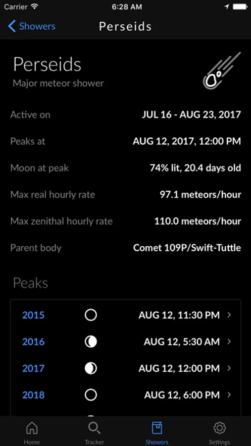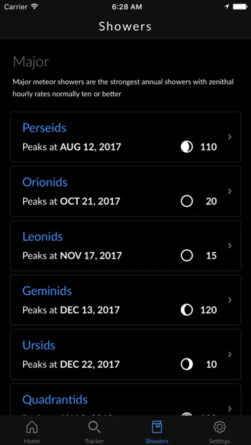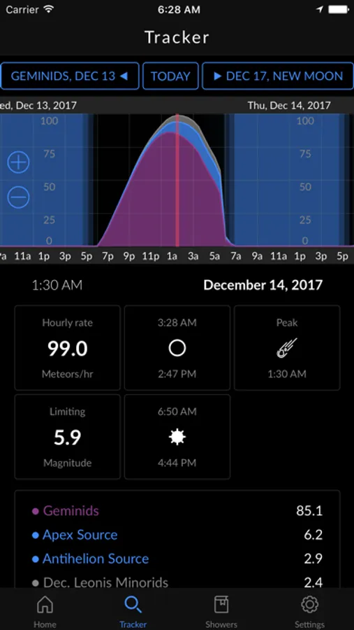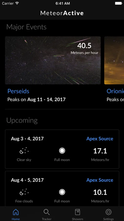 Meteor activity varies greatly from one night to another. Most of the time you can expect to see 3-15 meteors per hour, but several times per year this number could rise to 90, or even more! The MeteorActive app uses the latest scientific findings and cutting edge technology to calculate how many meteors you can see at given time. It takes into account your geographical location, meteoroid stream orbits, moon interference and light pollution to find the most spectacular events for you. Clear skies!