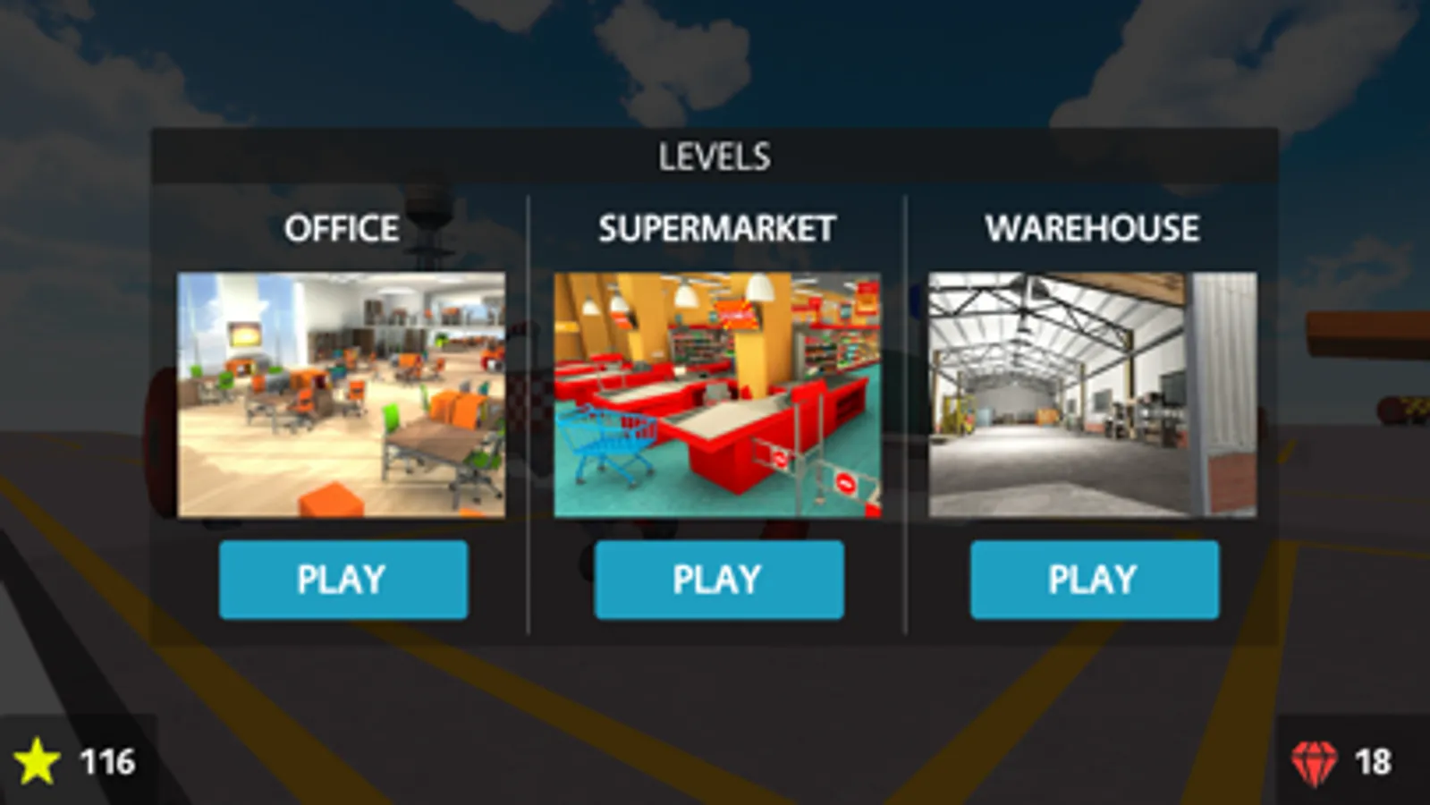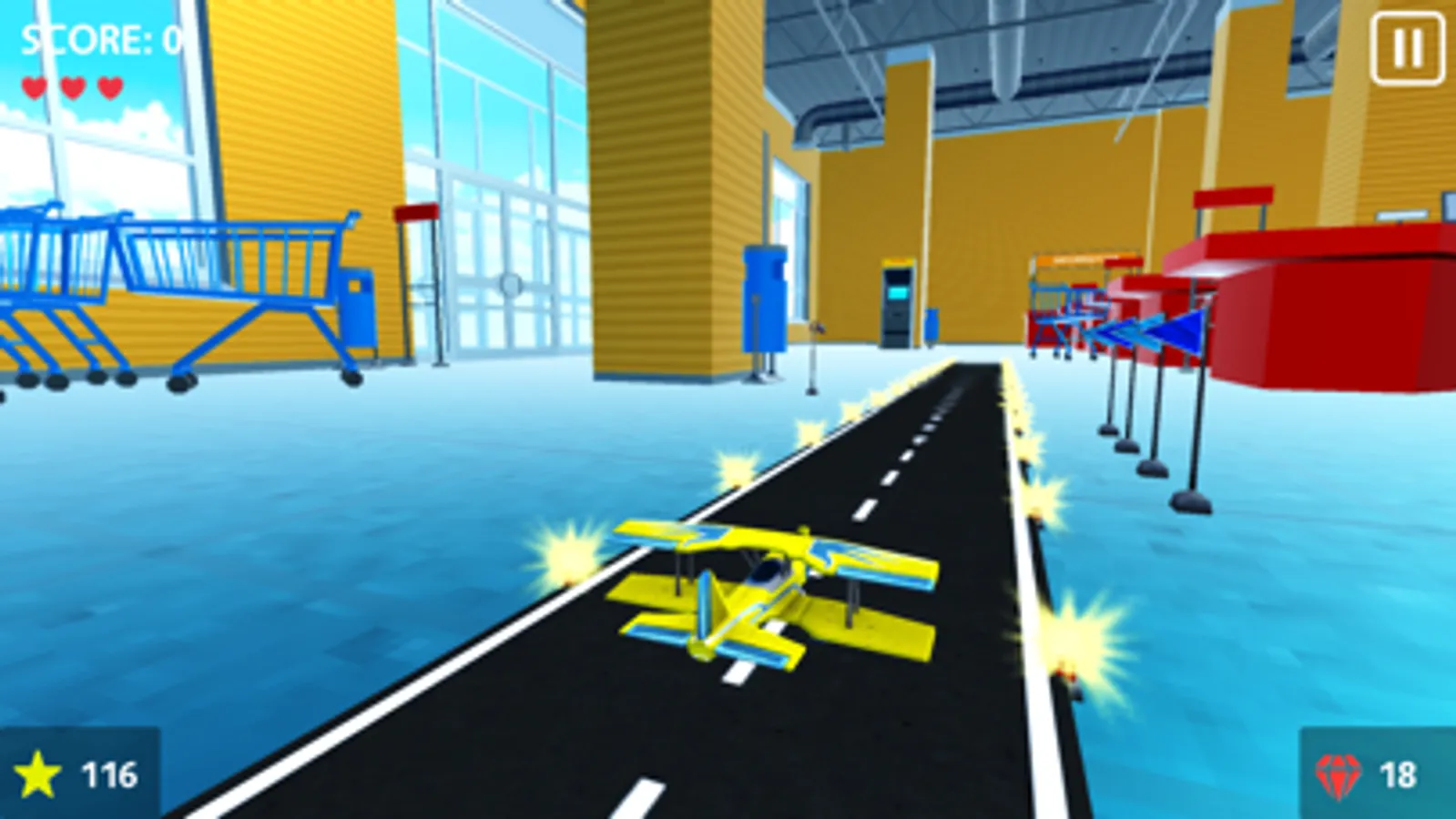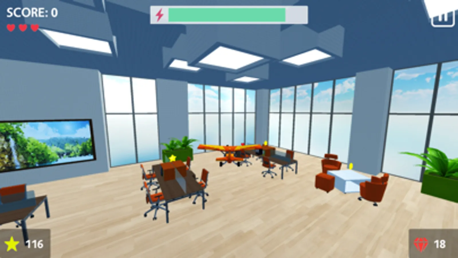 Fly remote controlled airplanes and collect stars at three different places: Office, Supermarket and Warehouse.