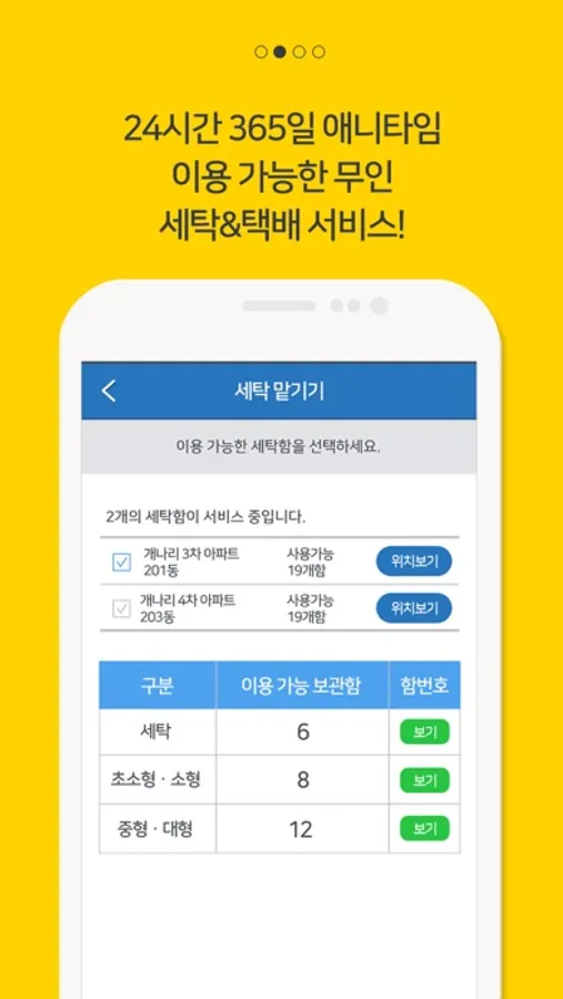 원하는 시간(24시간, 265일)에 세탁물을 맡기고 찾아갈 수 있는 편리한 서비스!