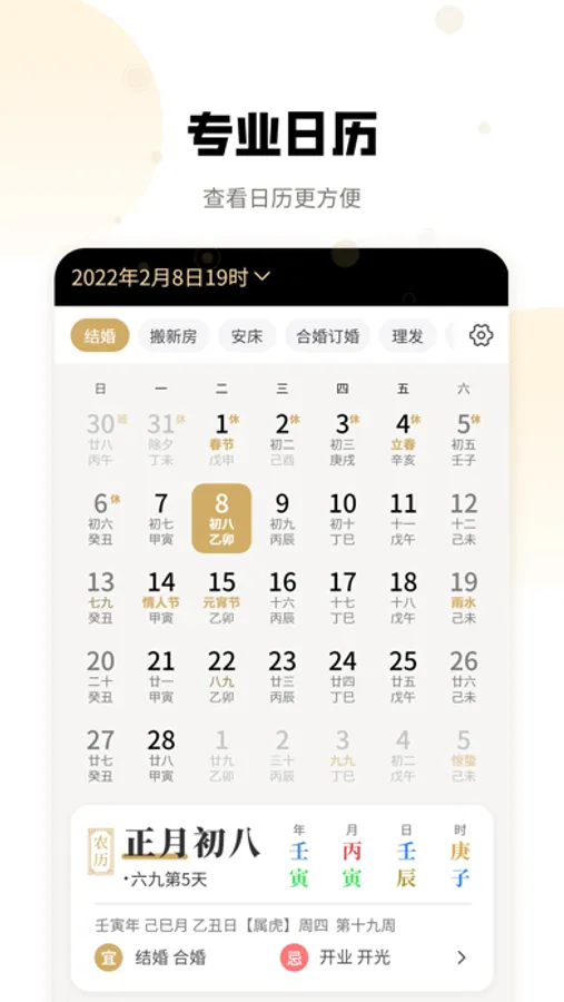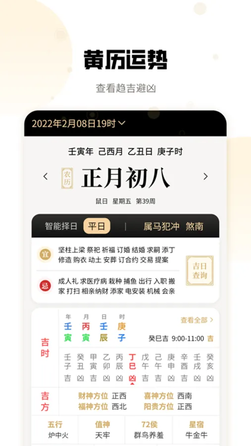 问真万年历是一个专业的日历应用,主要提供以下功能: 1、万年历查询:提供准确的公历、农历、节气、节假日信息。 2、老黄历查询:依托权威的《钦定协纪辩方书》等传统历法经典,提供每日宜忌、吉神、凶神、五行、冲煞、值神、四神位、建除十二日、二十八星宿、胎神、彭祖百忌、时辰吉凶等信息。 3、择吉:帮您挑选适合结婚、开业、出行、提案的日子,助您做事得天时。
