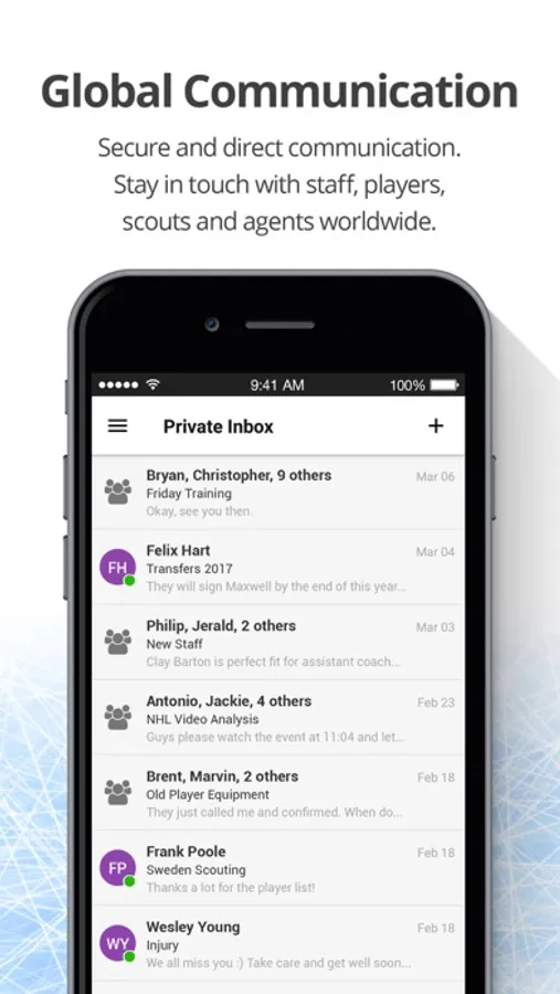 SportContract Communication allows Club Owners, Club CEOs, Managers, Managers Sport, Coaches, Scouts, Players, Player Unions, Agents worldwide to communicate with each other directly and discreetly.
