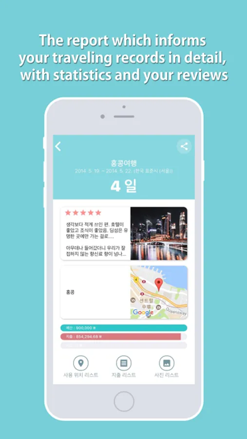 - You can also extract the expenditure statistics as csv (view with excel) file. The file also can be shared using sns or email. Wouldn't it be useful for organizing travel expenses?