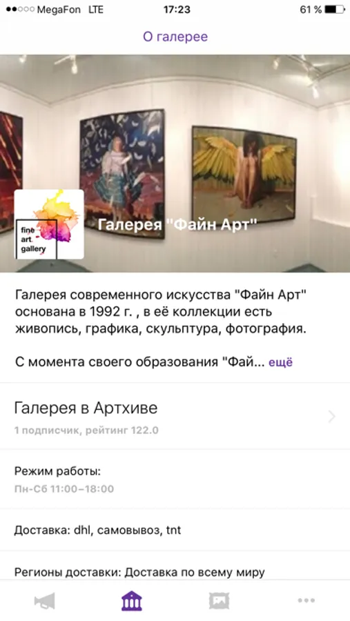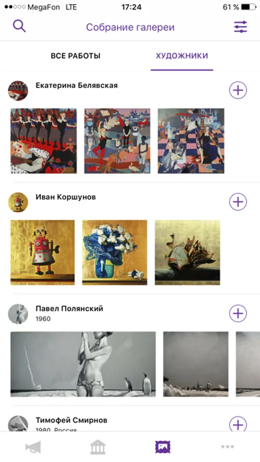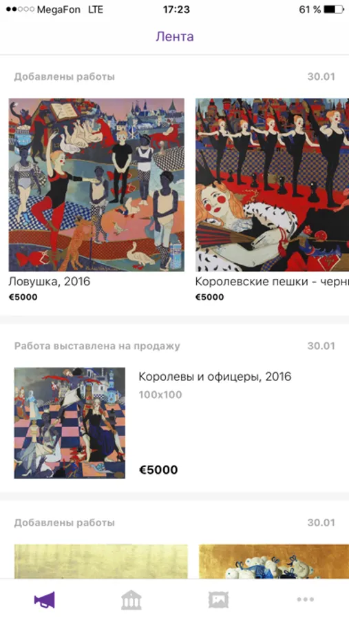 Главный экран приложения — привычная для соцсетей лента. Мы пополняем коллекцию, делимся историями, сообщаем о выставках, новых художниках и других событиях в галерее, и вы сразу об этом узнаете.
