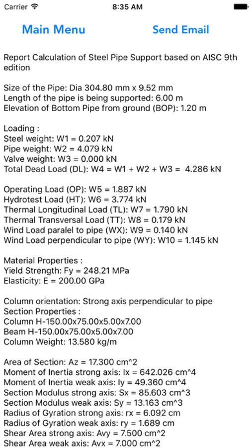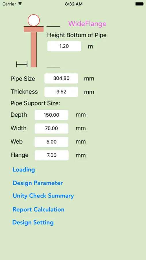 Apps for design and validate of WideFlange Pipe Support, elevated piping need to to be supported to reduce pipe spanning and stress in the pipe. Program consider combination of Gravity load (Steel self weight, Pipe weight, Operating liquid load, Hydrotest load), Thermal load, Wind load and provision to include Seismic load.