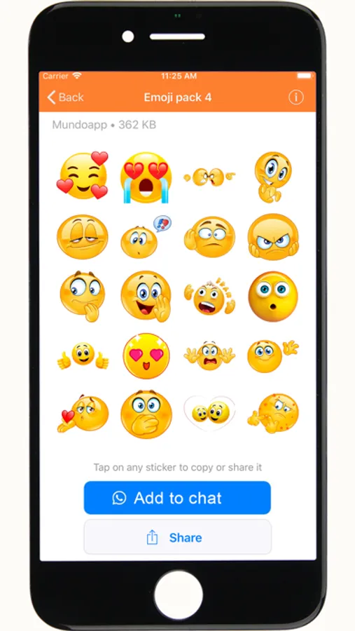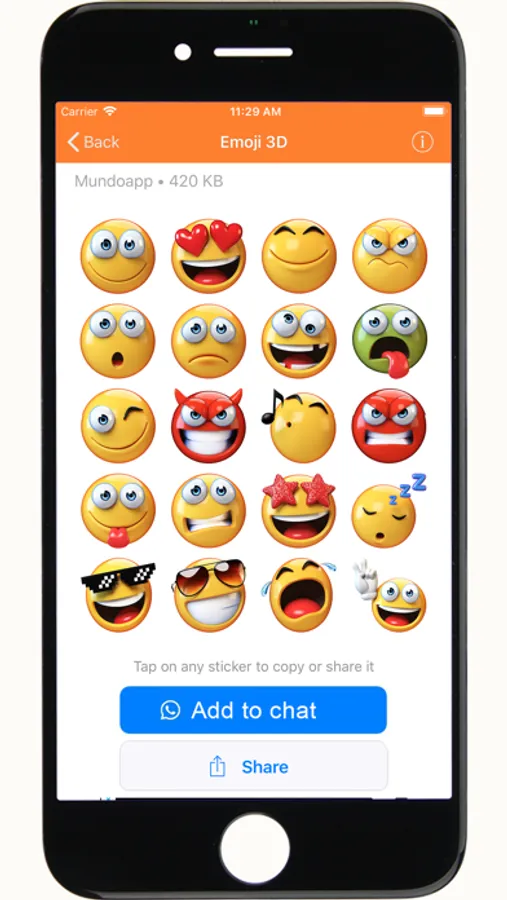 Share the cute faces of the emoticons in your favorite chat, it is very easy to use, you just have to open the application and choose the emoticon that you like the most, then you can save it on your device to use it as you want, or you can press the button. share to send the animated stickers by WhatsApp, Facebook or any social app.