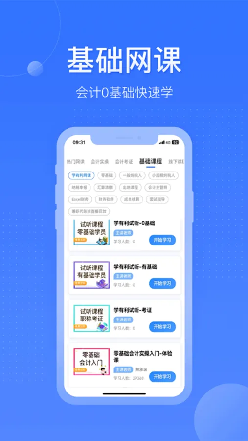 在线学习零基础会计入门、会计真账实操、财务软件、真实报税、行业会计、出纳、财税管理;