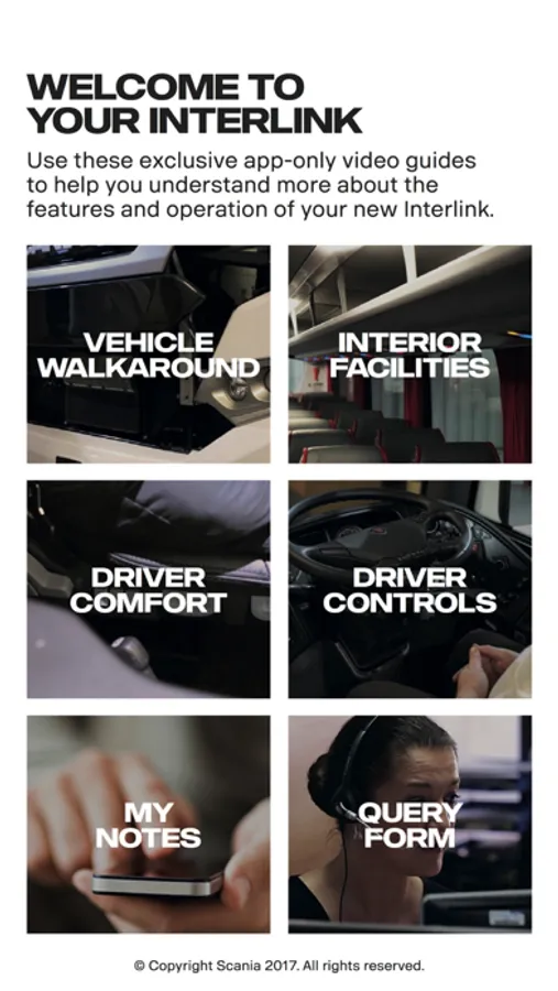 Welcome to Scania. Use this app to view our comprehensive range of video guides, helping you to get to grips with your vehicle's operation and features.